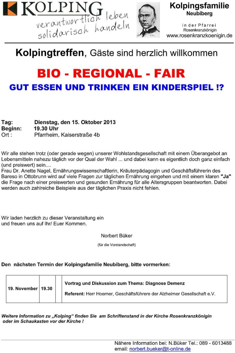 Referentin: Msgr. Christoph Huber, Präses Kolpingwerk Bayern Ort: Katholisches Pfarrheim, Kaiserstraße 4b, Neubiberg