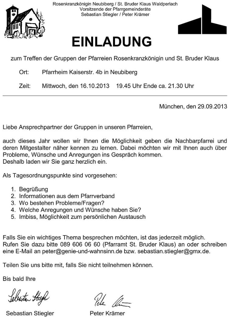 auch dieses Jahr wollen wir Ihnen am 16.10.2013 um 19.45 Uhr im Pfarrheim Rosenkranzkönigin, Neubiberg, die Möglichkeit geben die Nachbarpfarrei und deren Mitgestalter näher kennen zu lernen. Dabei möchten wir mit Ihnen auch über Probleme, Wünsche und Anregungen ins Gespräch kommen. Deshalb laden wir Sie ganz herzlich ein.