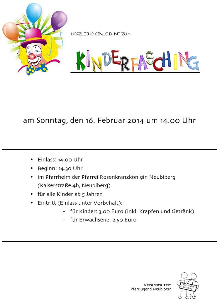 Einlass: 14.00 Uhr Beginn: 14.30 Uhr Ort: Pfarrheim der Pfarrei Rosenkranzkönigin (Kaiserstraße 4b, 85579 Neubiberg) Zielgruppe: Alle Kinder ab 5 Jahren Eintritt: 3,00 EUR für Kinder (inkl. Krapfen und Getränk), 2,50 EUR für Erwachsene