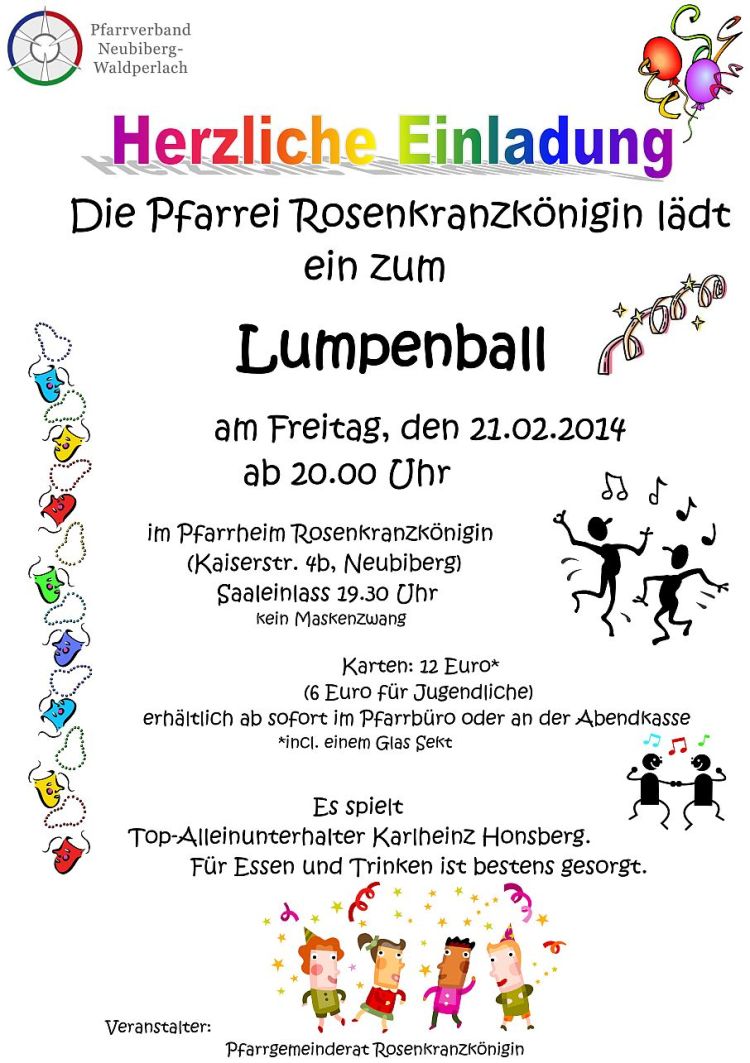 Herzliche Einladung zum Pfarrfasching "Lumpenball" am Freitag, den 21.02.2014 um 20.00 Uhr im Pfarrheim Rosenkranzkönigin, Kaiserstraße 4b, 85579 Neubiberg