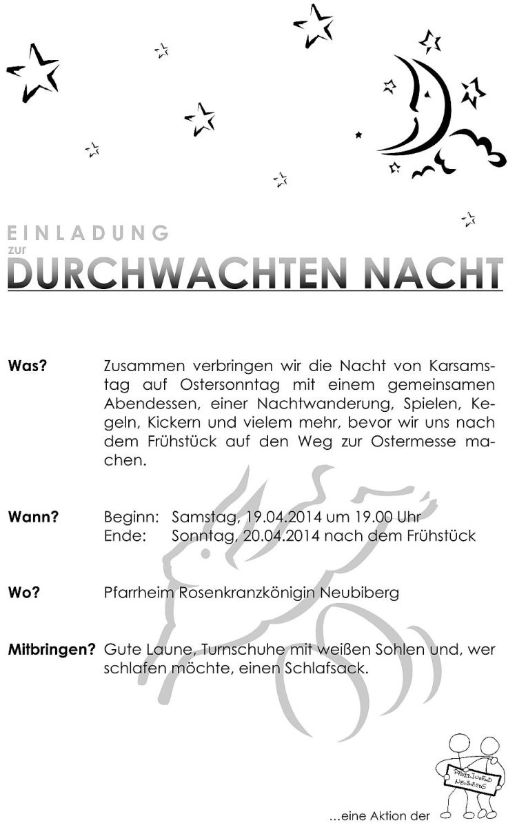 Wo? Zeltplatz am ... mehr Zusammen verbringen wir die Nacht von Karsamstag auf Ostersonntag mit einem gemeinsamen Abendessen, einer Nachtwanderung, Spielen, Kegeln, Kickern und vielem mehr, bevor wir uns nach dem Frühstück auf den Weg zur Ostermesse machen. ... mehr Nach so tollen Novenen kommt jetzt die Fortsetzung!