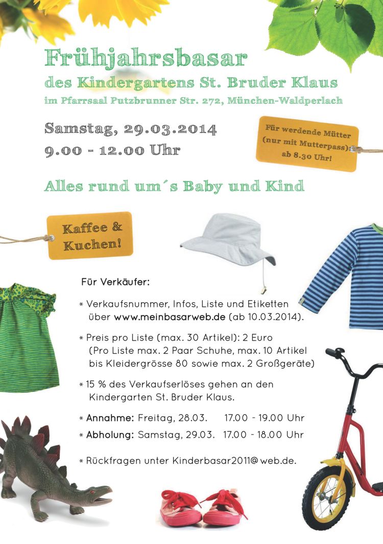 Frühjahrsbasar des Kindergartens St. Bruder Klaus im Pfarrsaal Putzbrunner Straße 272, München-Waldperlach, Samstag, 29.03.2014, 09.00 Uhr bis 12.00 Uhr (für werdende Mütter nur mit Mutterpass: ab 08.30 Uhr)