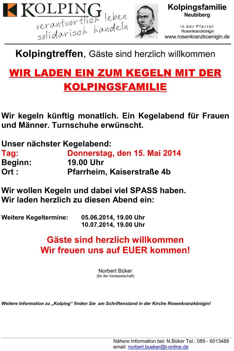 Wir laden ein zum Kegeln mit der Kolpingsfamilie Wir wollen Kegeln und dabei viel SPASS haben. Ein Kegelabend für Frauen und Männer. Turnschuhe erbeten. Tag:  Montag, den 11. Dezember 2014 Beginn: 19:00 Uhr Ort: Pfarrheim Rosenkranzkönigin, Kaiserstraße 4b Leitung: Dieter