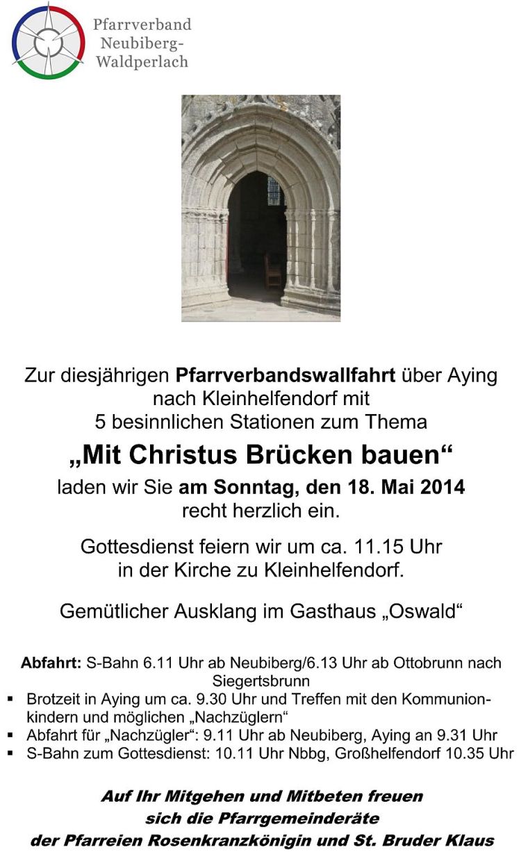Zur diesjährigen Pfarrverbandswallfahrt über Aying nach Kleinhelfendorf mit 5 besinnlichen Stationen zum Thema "Mit Christus Brücken bauen" laden wir Sie am Sonntag, den 18. Mai 2014, recht herzlich ein.