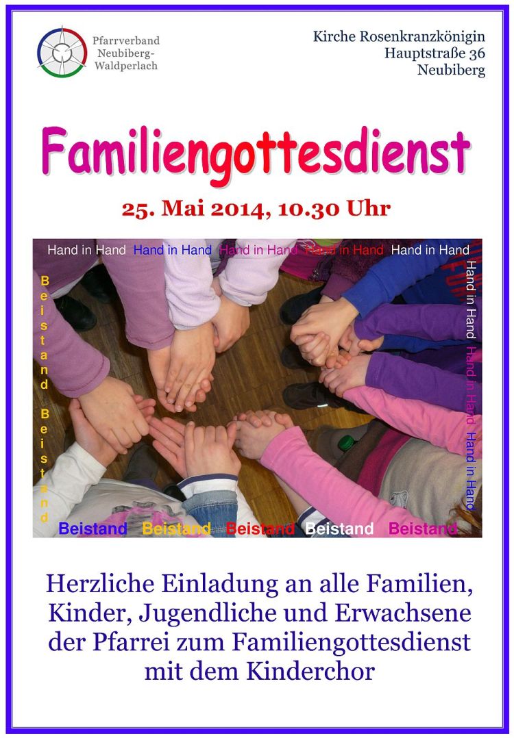 Familiengottesdienst am 25.05.2014 um 10.30 Uhr zum Thema "Hand in Hand - Beistand". Herzliche Einladung an alle Familien, Kinder, Jugendliche und Erwachsene der Pfarrei zum Familiengottesdienst mit dem Kinderchor in der Kirche Rosenkranzkönigin.